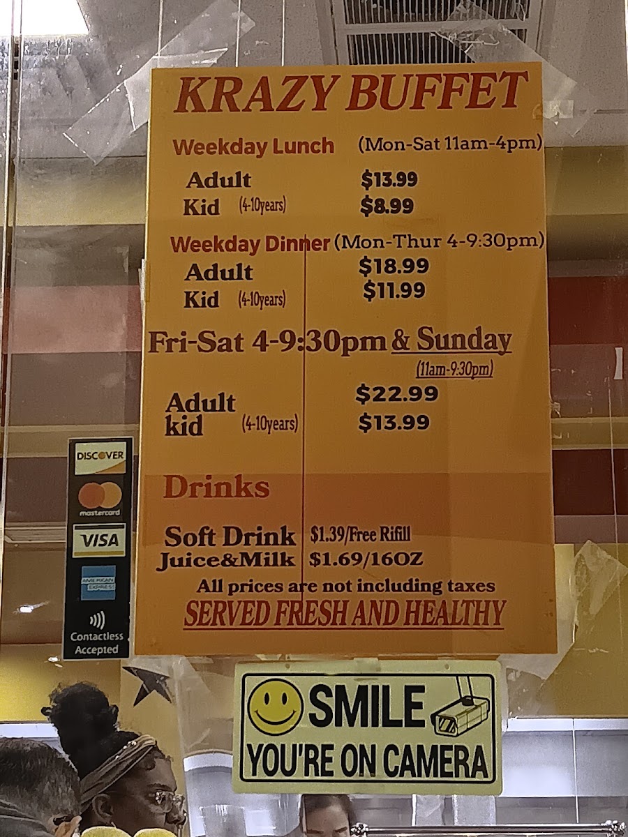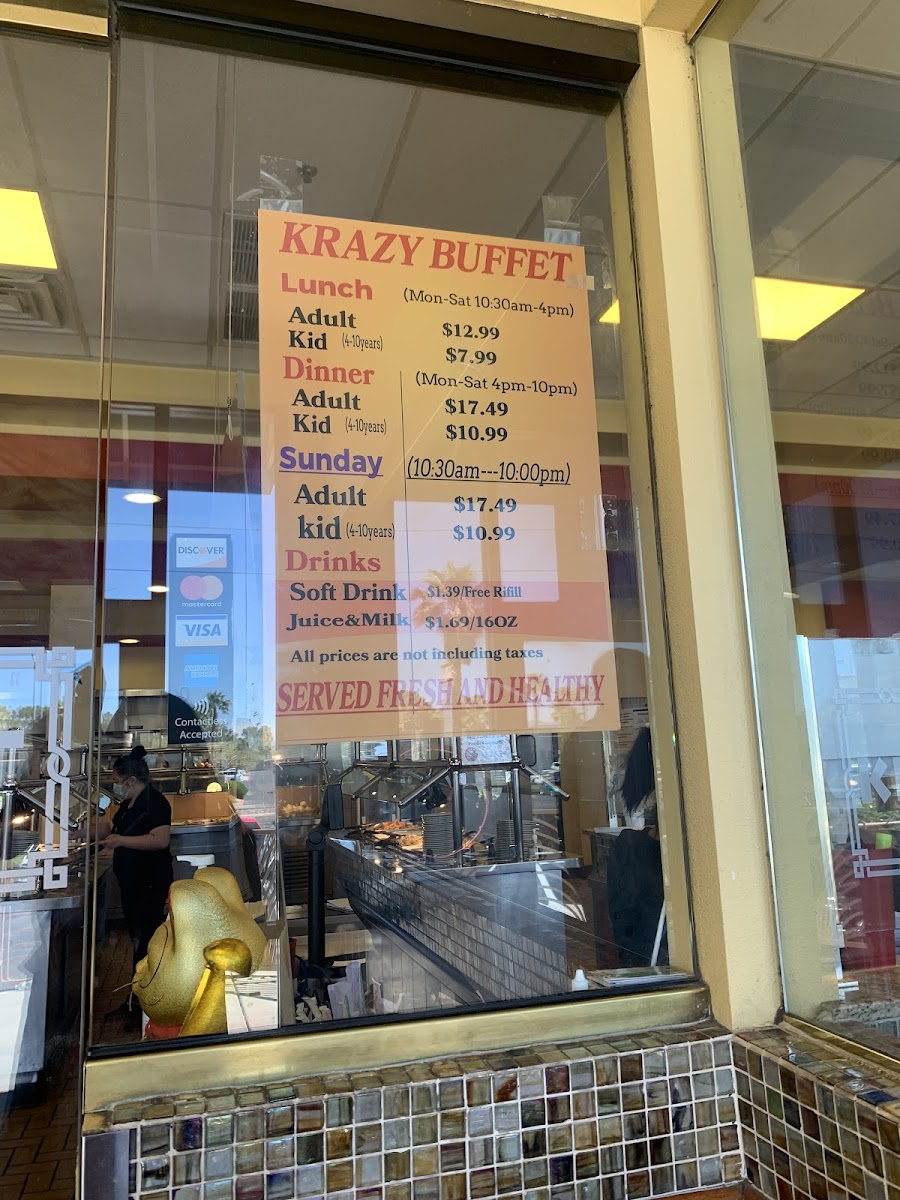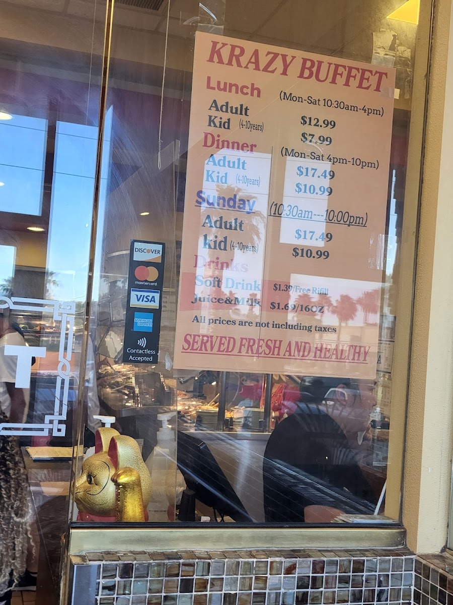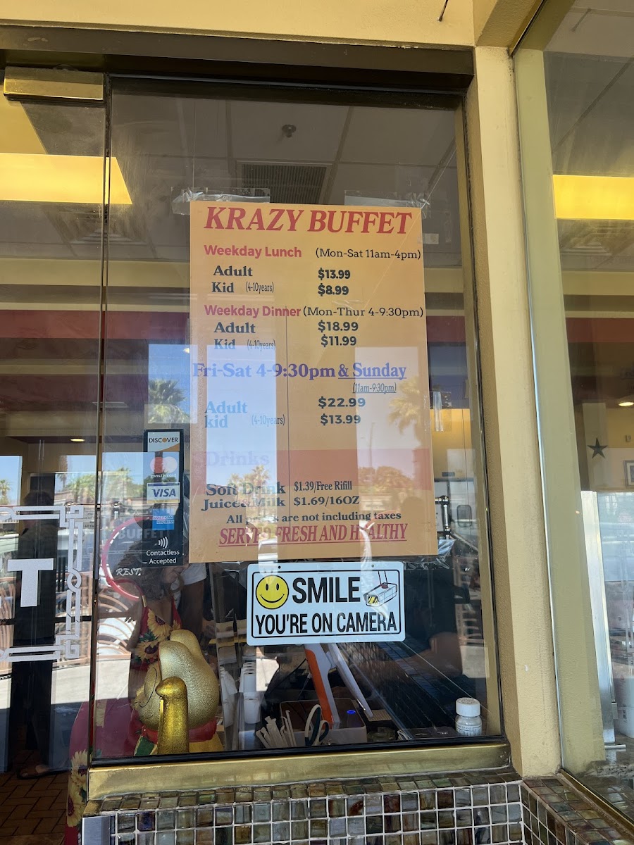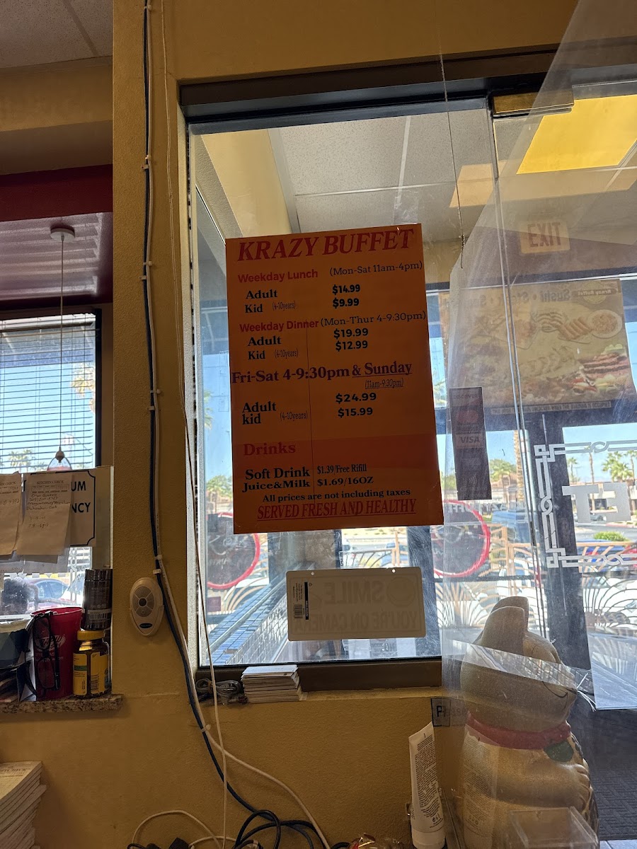 The Krazy Buffet is certainly a great place to eat when you want Asian Buffet food. This was our first time visiting this restaurant. When we arrived, we were given a number, and we had about a 30-minute wait. It was about 103 degrees in Vegas, so the wait outside was very hot. But the line moved quickly. We noticed right away that this was a popular place to eat for the locals, so we knew it would be good. When we were seated there the place was busting with people. Apparently we came when the crab legs were on the Buffet line. Yummy!!!!! The staff couldn't keep up with the demand, as soon as the crab legs were out, they were gone! The restaurant was clean for as much foot traffic was going through. The staff was friendly, and they kept our drinks full. Lots to choose from on the Buffet line. If you went home hungry, it was your fault. There were 8 of us that stuffed face there, we all left full and happy.